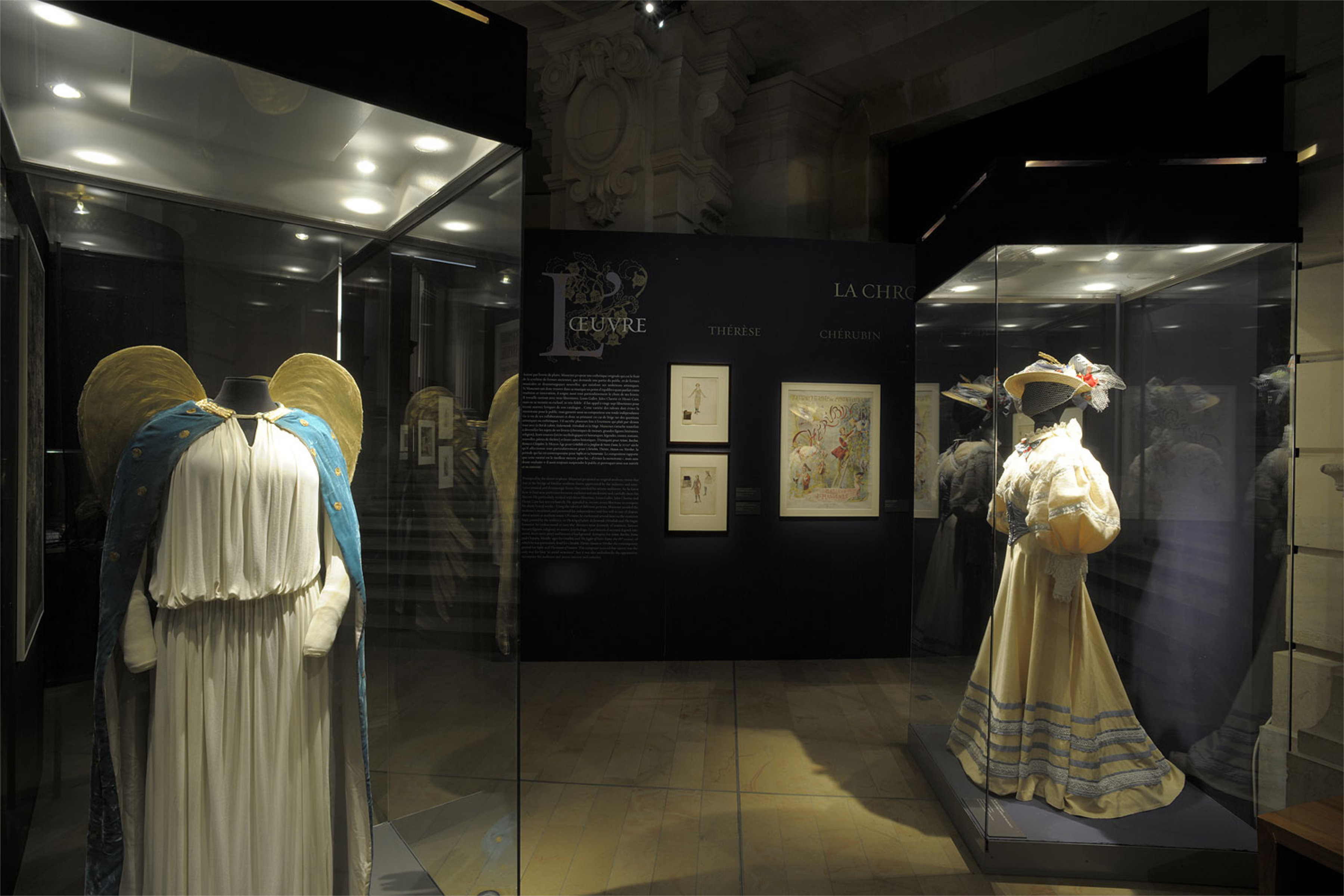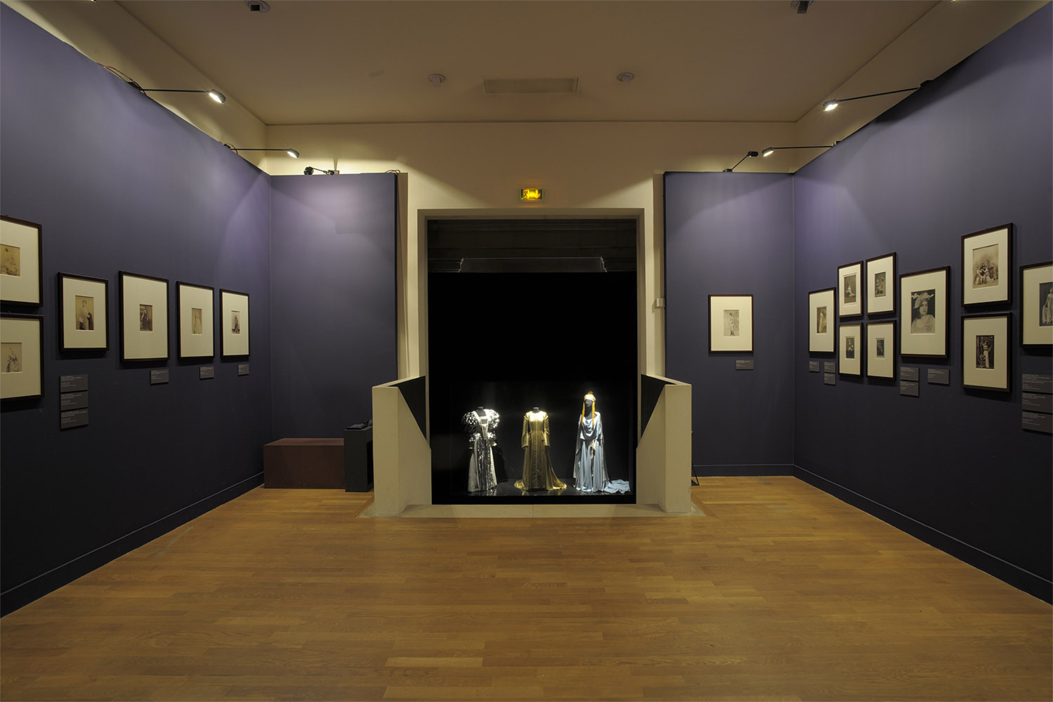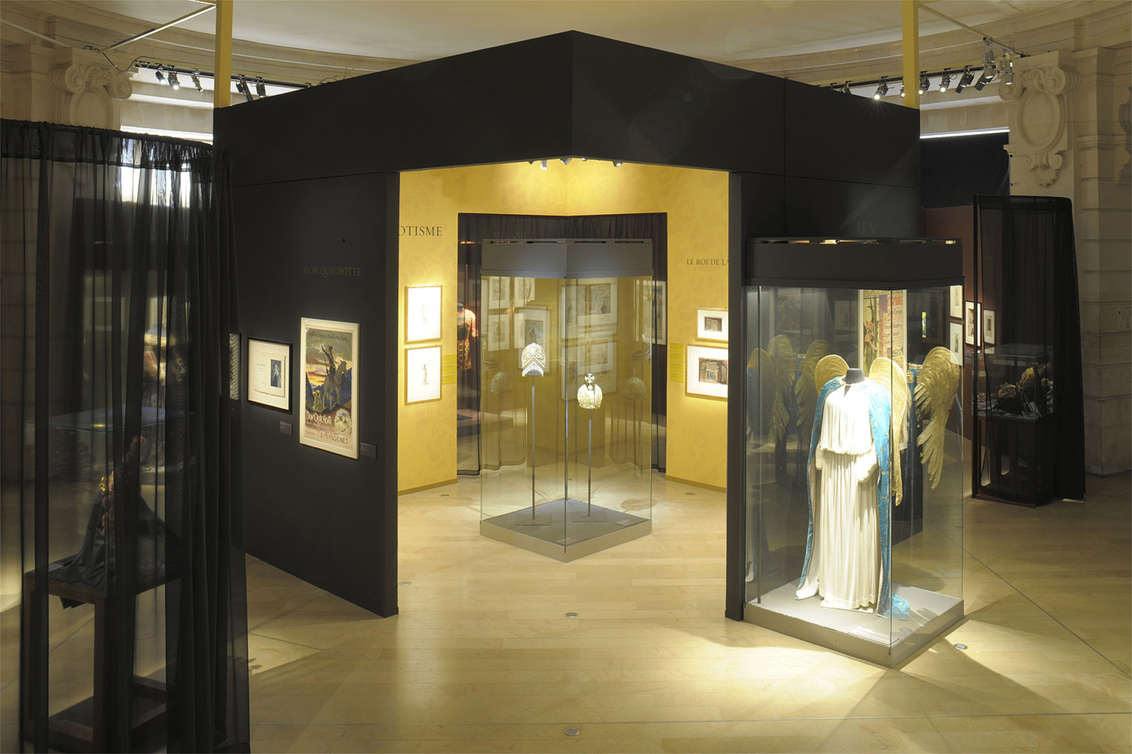 Les aménagements maintiennent un lien étroit entre l’architecture des espaces et le caractère théâtral de l’exposition. Tout comme au théâtre, et surtout à l’opéra, costumes, personnages, décors et accessoires se détachent en lumière sur un fond d’ombre.