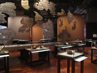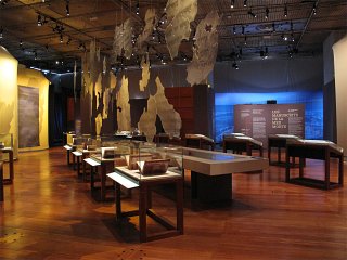 Les ambiances scénographiques s’inspirent autant de référents géographiques que de simples objets comme les jarres. La scénographie rend lisible la relation permanente entre extérieur et intérieur du site et des grottes. Des agrandissements de fragments des manuscrits sont utilisés comme éléments graphiques de partition des espaces. Les couleurs font écho aux matières et paysages locaux : sel, mer, sable, roches, terres.