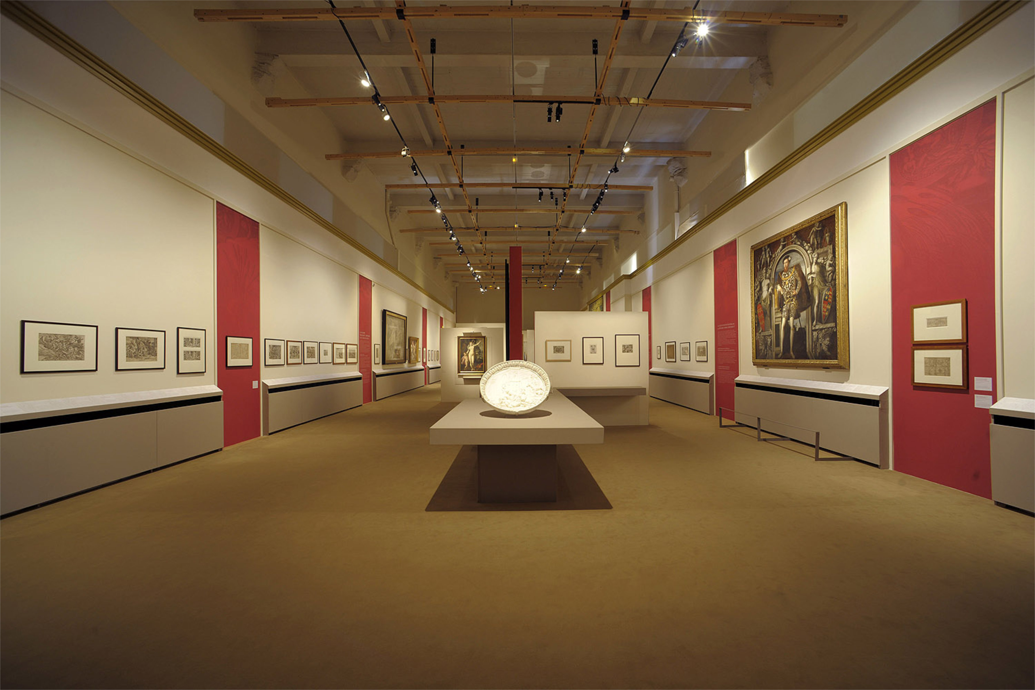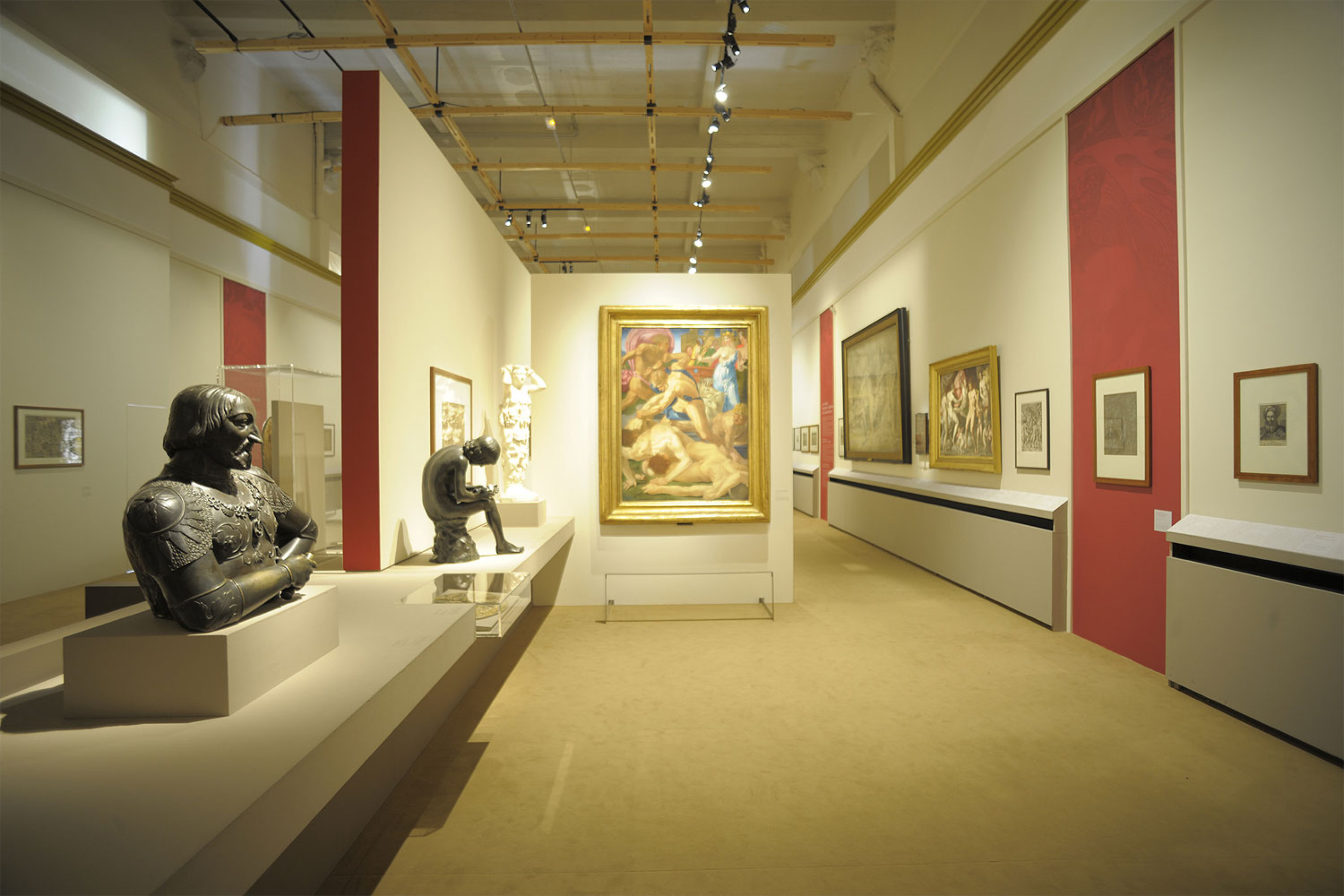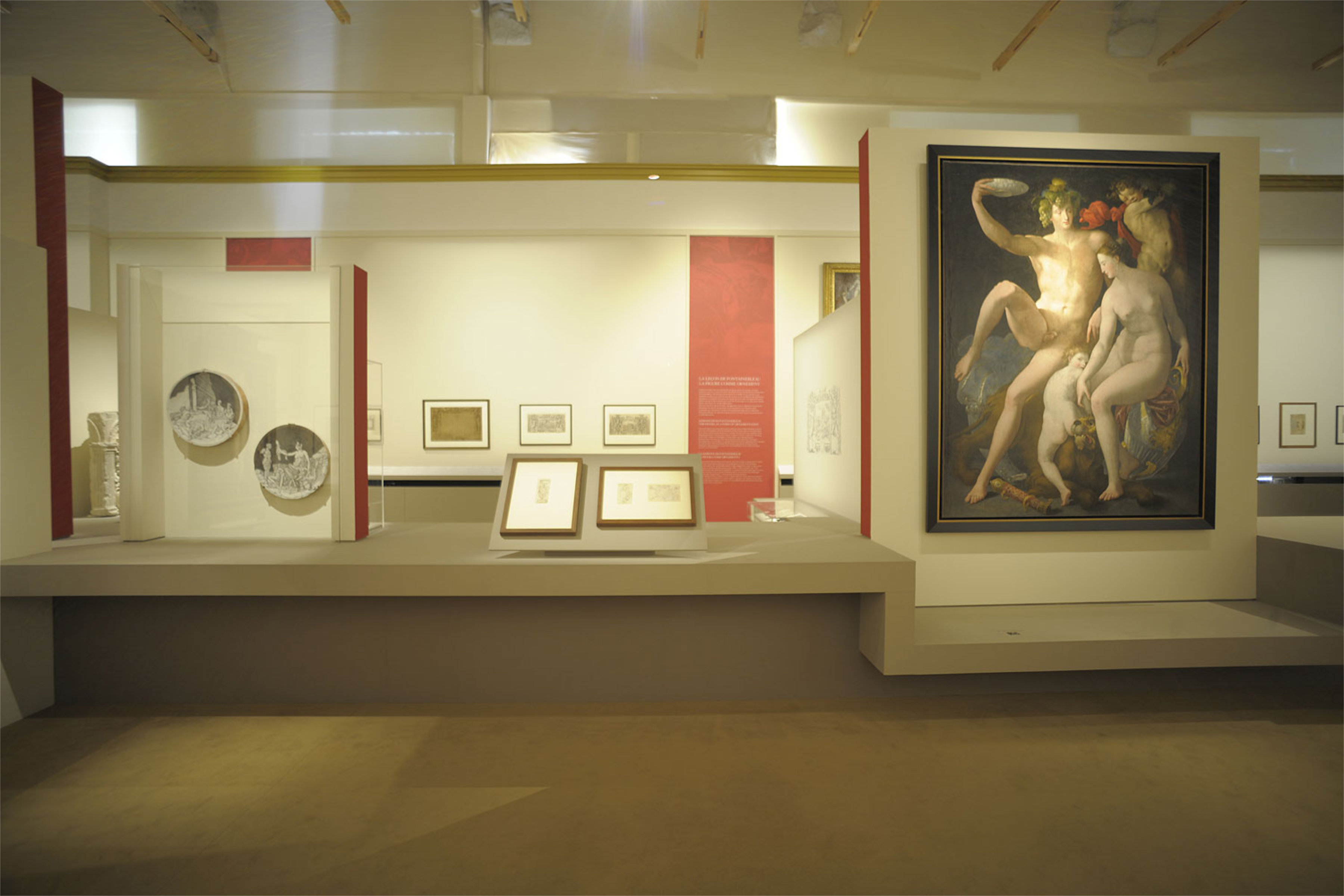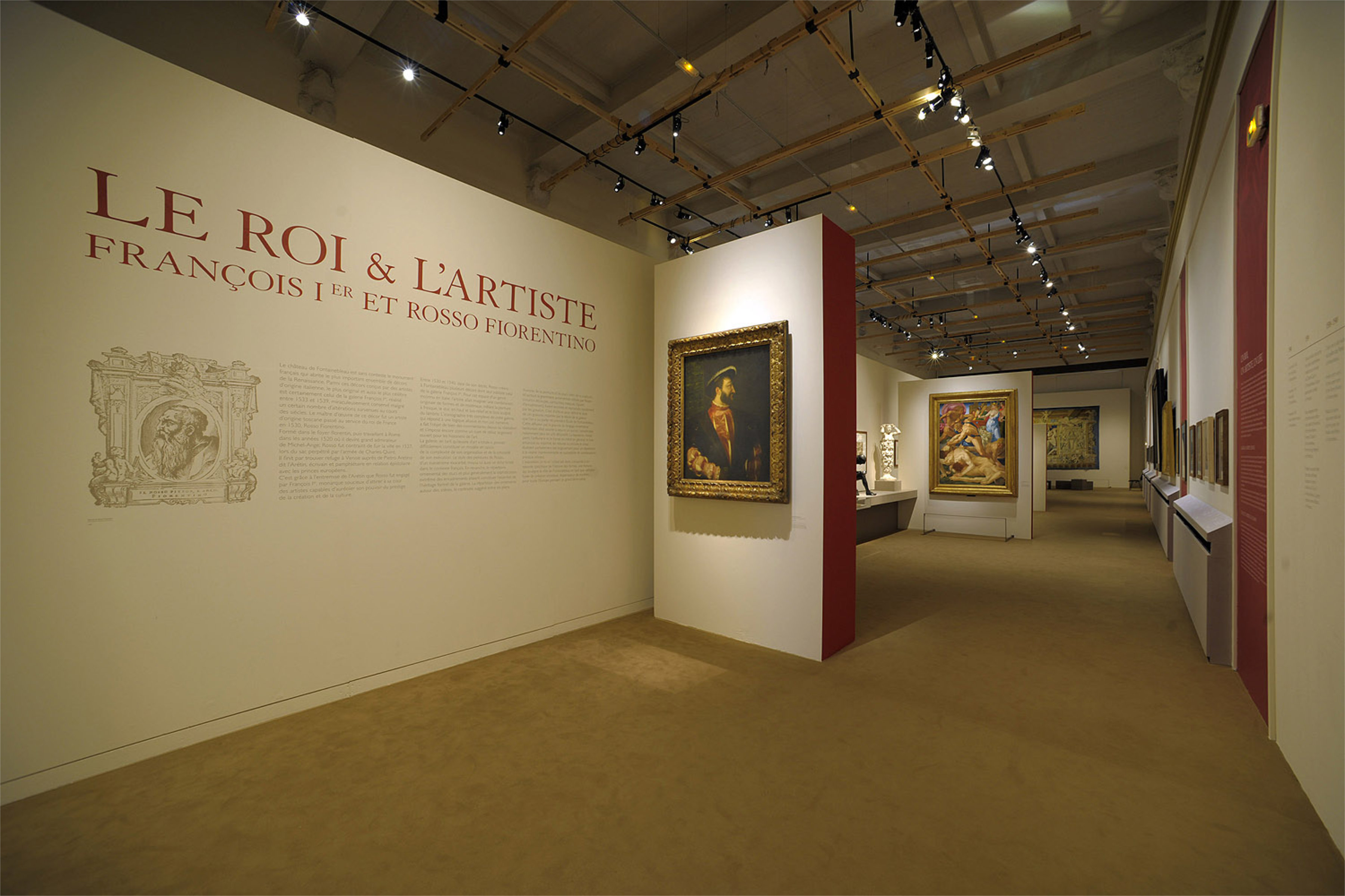 Les aménagements scénographiques de l’exposition reprennent la partition et le rythme ternaire des travaux de Rosso dans la galerie François 1er. Les parois de la salle d’exposition sont découpées verticalement en travées, organisant des ensembles d’œuvres comme des cabinets. Les aménagements rappellent l’organisation des décors de Rosso entre stylobate, partie courante d’accrochage et corniche haute. Un mobilier linéaire se déploie au centre de la galerie sur une grande table qui regroupe des vitrines encastrées, des vitrines hautes, mais aussi des protections vitrées et dosserets permettant de rythmer l’espace.